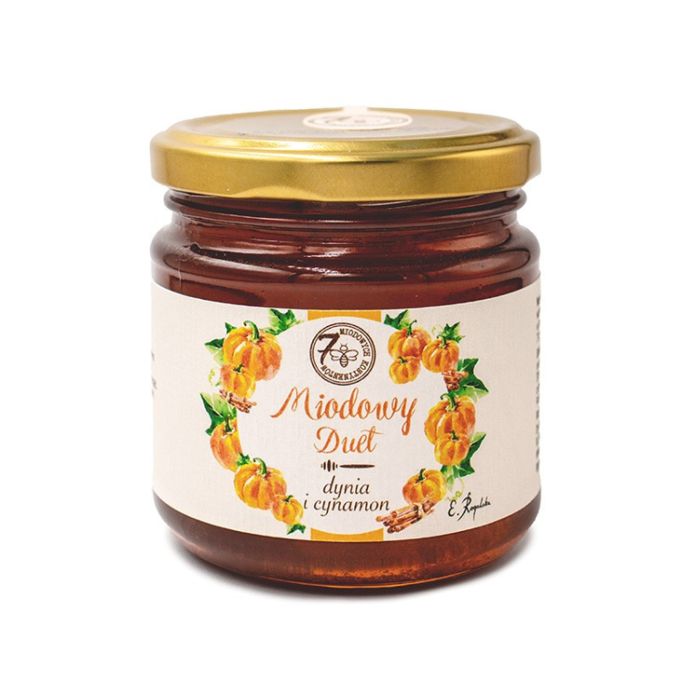 Składniki: miód pszczeli wielokwiatowy 98%, 2% pasty o smaku dyni z cynamonem (cukier, dynia (min 30%), woda, cynamon, regulator kwasowości: kwas cytrynowy, ekstrakt papryki