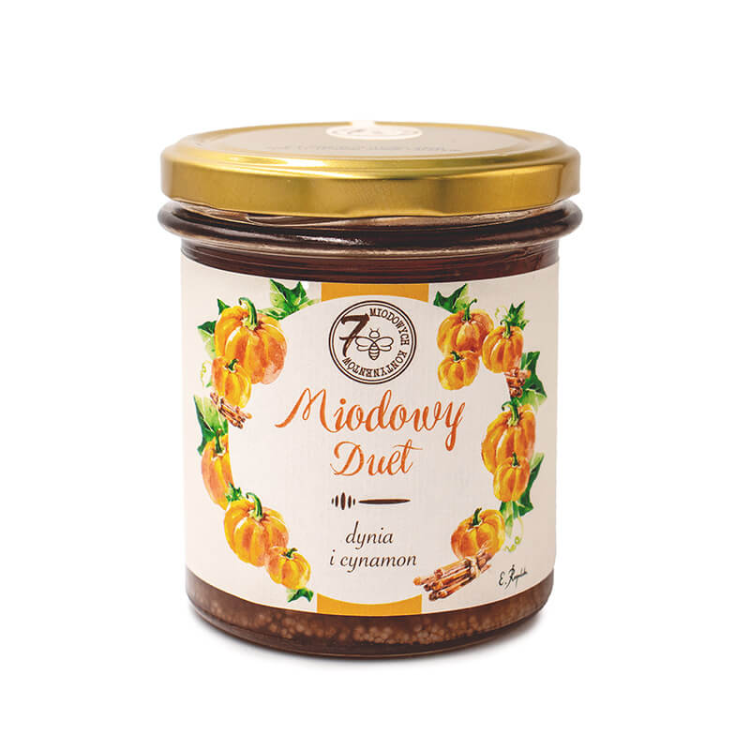 Składniki: miód pszczeli wielokwiatowy 98%, 2% pasty o smaku dyni z cynamonem (cukier, dynia (min 30%), woda, cynamon, regulator kwasowości: kwas cytrynowy, ekstrakt papryki, fruktoza 2%