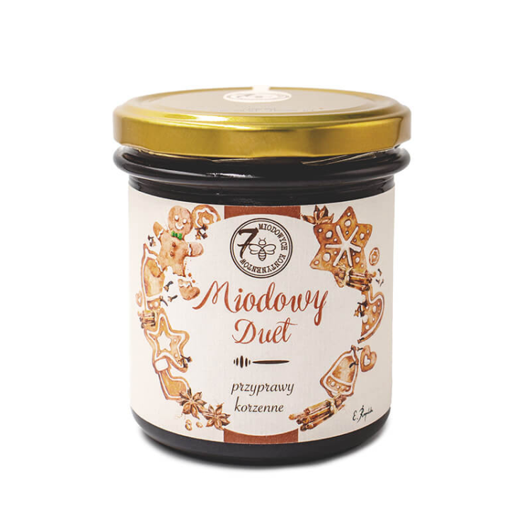 Składniki: miód pszczeli wielokwiatowy 98%, 2% pasty o smaku korzennym (cukier, woda, cukier palony, cynamon (min.5%), aromat, goździki <0,1%, imbir <0,1%